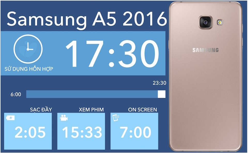 Samsung A5 2016 đạt được thời gian onscreen quá tốt lên đến 7 tiếng đồng hồ và thời gian sử dụng hỗn hợp cũng đạt một con số cao là 17 tiếng 30 phút. Với những con số này, A5 vượt qua rất nhiều những siêu phẩm đầu bảng, và hiện là một trong những sản phẩm tầm trung có thời lượng sử dụng pin lâu nhất hiện nay. Và một điều đáng nói là màn hình của A5 là fullhd độ phân giải 1080 x 1920 không như các sản phẩm tầm trung phổ biến chỉ được độ phân giải 720p.