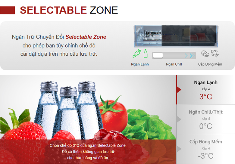 Tủ lạnh Hitachi HRTN6443SGBKVN nổi bật với ngăn chuyển đổi đa năng Selectable Zone, mang đến sự linh hoạt trong bảo quản thực phẩm. Ngăn này cho phép người dùng tùy chỉnh 3 mức nhiệt độ để phù hợp với từng loại thực phẩm. Với mức -3°C, bạn có thể cấp đông mềm thực phẩm tươi sống, giúp chế biến ngay mà không cần rã đông. Mức 0°C lý tưởng để bảo quản thịt, cá và hải sản, trong khi mức 3°C phù hợp để lưu trữ trái cây, rau củ và đồ uống.