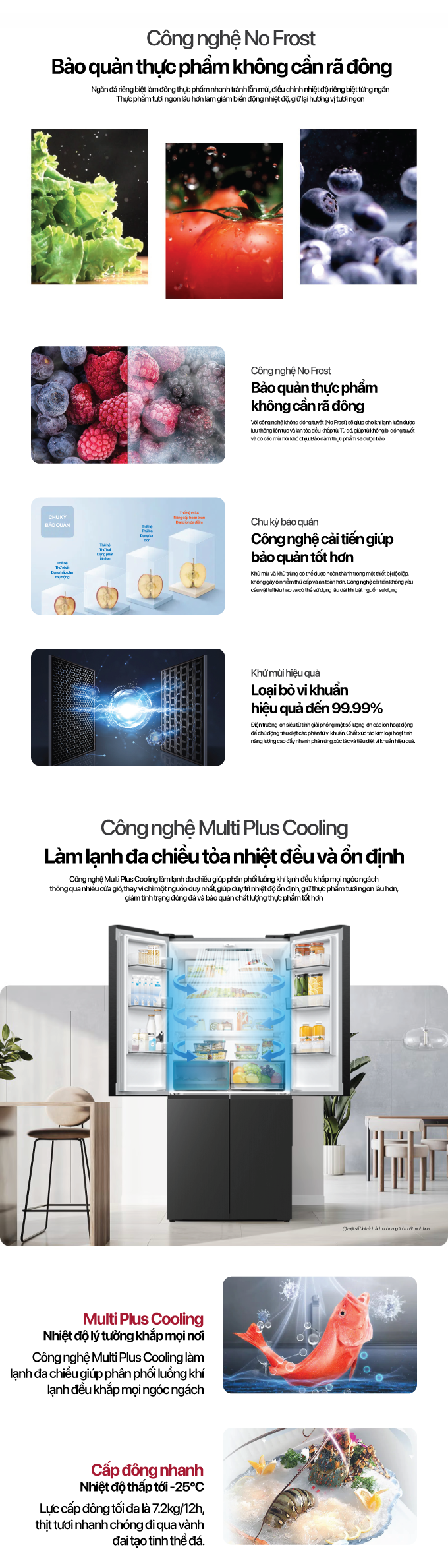 Hệ thống làm lạnh đa chiều Multi Plus Cooling kết hợp với môi chất lạnh Gas R600a giúp luồng khí lạnh lan tỏa đều khắp mọi ngóc ngách. Thực phẩm dù đặt ở vị trí nào cũng được làm lạnh nhanh và sâu, giữ được độ tươi ngon lâu dài. Ngăn bảo quản khô và ẩm cũng được thiết kế riêng biệt để hạn chế tối đa tình trạng lẫn mùi.