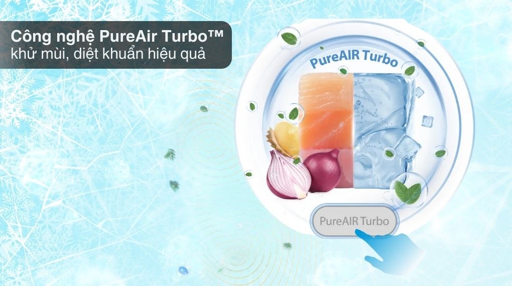 - Tủ lạnh sử dụng bộ lọc PureAir Turbo™ giúp khử mùi hôi mạnh mẽ, ngăn ngừa vi khuẩn phát sinh trong khoang tủ. Giữ không khí bên trong luôn trong lành, giảm mùi lẫn nhau giữa thực phẩm, tăng hiệu quả bảo quản lâu dài.