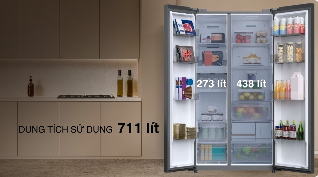 - Dung tích sử dụng lên đến 711 lít đáp ứng tốt nhu cầu bảo quản thực phẩm đa dạng của các gia đình lớn.