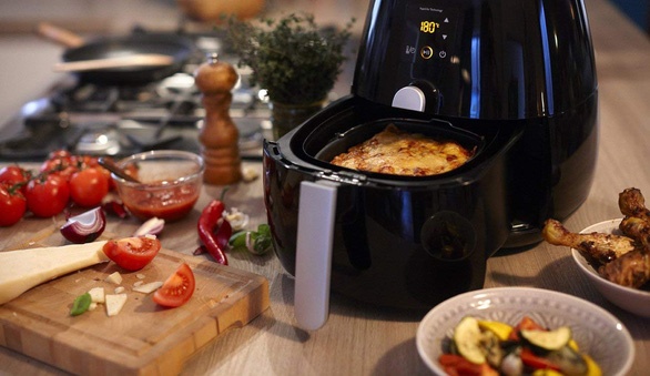 Nồi chiên không dầu (air fryer) có quạt đối lưu sử dụng khí nóng để làm chín thực phẩm, giảm 70 - 80% lượng dầu khi sử dụng nồi chiên bình thường.