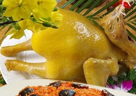 - Gà làm sạch, dùng rượu và muối xát quanh mình gà rồi rửa lại với nước cho sạch. Hòa hỗn hợp gồm bột nghệ và dầu vừng (mè) xát đều khắp mình gà (với những con gà có da màu vàng tự nhiên thì không cần. Với những con gà có da màu trắng làm thế để sau khi hấp da gà sẽ căng bóng và có màu vàng đẹp mắt ).