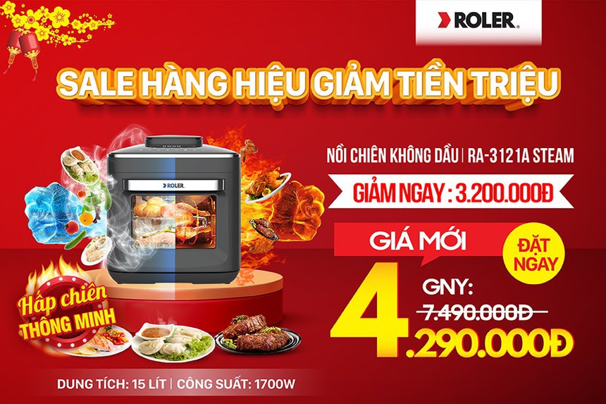 Theo đó, chỉ với 4,29 triệu đồng, chị em đã có thể sở hữu nồi chiên không dầu điện tử đa năng kết hợp hơi nước Roler RA-3121A Steam 15 lít, tiết kiệm 3,2 triệu đồng so với giá niêm yết 7,49 triệu đồng.