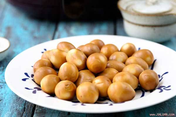 Bước 5: Đủ thời gian thì bạn nhấc nắp lên, lúc này trứng đã chuyển sang màu nâu, có mùi thơm của hương cam rất lạ.
