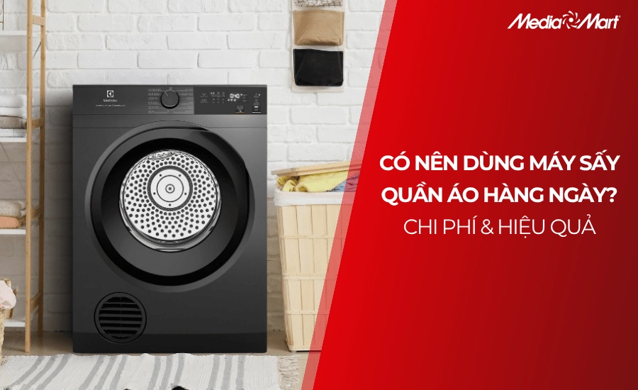 Máy sấy quần áo là giải pháp tiện lợi giúp làm khô trang phục nhanh chóng bằng nhiệt và khí nóng, mang lại sự tiện nghi vượt trội cho cuộc sống hiện đại. Tuy nhiên, câu hỏi có nên dùng máy sấy quần áo hàng ngày hay không vẫn là mối băn khoăn lớn của nhiều gia đình, đặc biệt là về vấn đề chi phí điện năng. Trong bài viết dưới đây, MediaMart sẽ giải đáp một cách khách quan nhất về hiệu quả thực tế và các khoản chi phí liên quan để người tiêu dùng có thể cân nhắc nên mua máy sấy quần áo và sử dụng thường xuyên hay không!