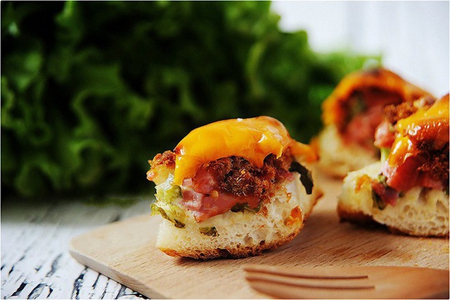 Còn gì hấp dẫn hơn món bánh mì nướng được phủ dày một lớp phô mai với cách làm đơn giản nhưng trông thì rất công phu này? Một lát bánh mì mà đủ đầy hương vị, có chút mặn mặn của chà bông cháy xém quyện với phô mai thơm, có xúc xích và thịt xông khói ngon ngon được trộn đều cùng mayonnaise béo ngậy. Không những thế, món ăn còn hấp dẫn bởi sự kết hợp của xà lách và ớt chuông giúp đảm bảo khẩu phần rau củ hàng ngày nữa đấy!