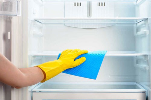 - Dọn sạch đồ ăn trong tủ lạnh và xịt dung dịch lên những chỗ cần làm sạch