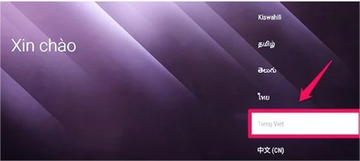 Bước 1: Mở smart tivi Sony lên, màn hình sẽ hiển thị màn Xin Chào, và bước này bạn chọn Ngôn ngữ Tiếng Việt nhé!