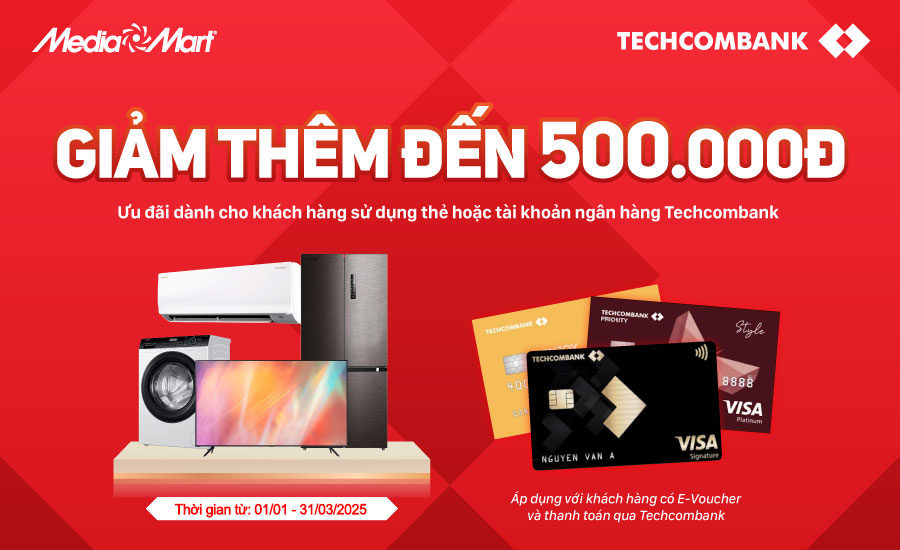 Từ ngày 01/01/2025 đến hết ngày 31/03/2025, khách hàng khi thanh toán mua sắm bằng thẻ/ tài khoản Techcombank cho đơn hàng từ 20 Triệu đồng trở lên tại Hệ thống siêu thị điện máy Mediamart sẽ nhận ngay eVoucher 500K. Ưu đãi có hạn, nhanh tay đặt mua ngay kẻo lỡ !