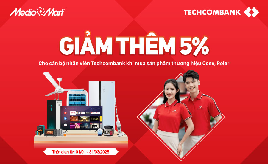 Từ ngày 01/01/2025 đến 31/03/2025, MediaMart triển khai chương trình ưu đãi đặc biệt dành riêng cho cán bộ nhân viên Techcombank. Khách hàng sẽ được giảm thêm 5% khi mua các sản phẩm thương hiệu Roler, Coex tại MediaMart.